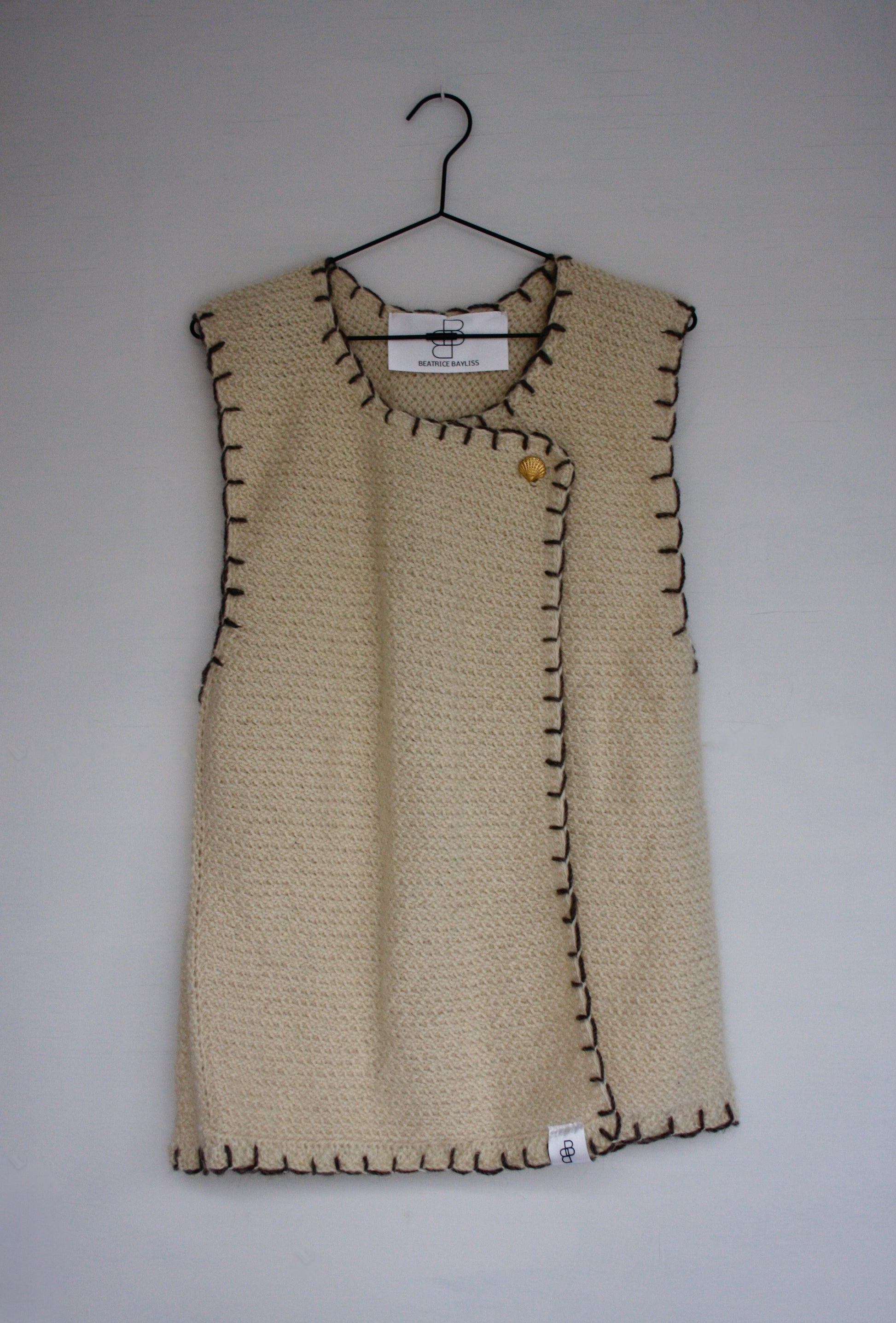 Designed with clean, architectural lines and a softly structured silhouette, the piece layers effortlessly over shirts, knits or dresses. The asymmetric wrap front is secured with a single shell button, a subtle nod to coastal craft and considered detail.